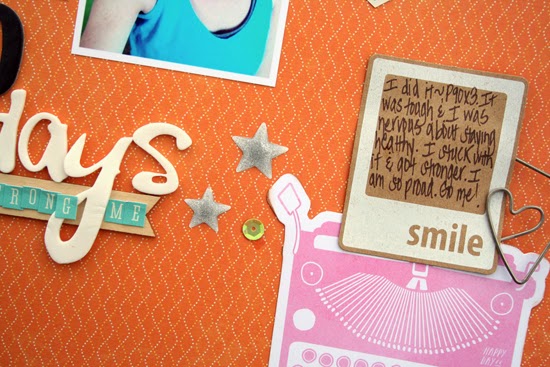 I also used this pink typewriter as a way to record my accomplishment. I placed the Smile frame as if I typed out my journaling. Not every page needs a ton of journaling to tell the story. There was just enough room to share my feelings. I added fun details like the sequins and stars.
